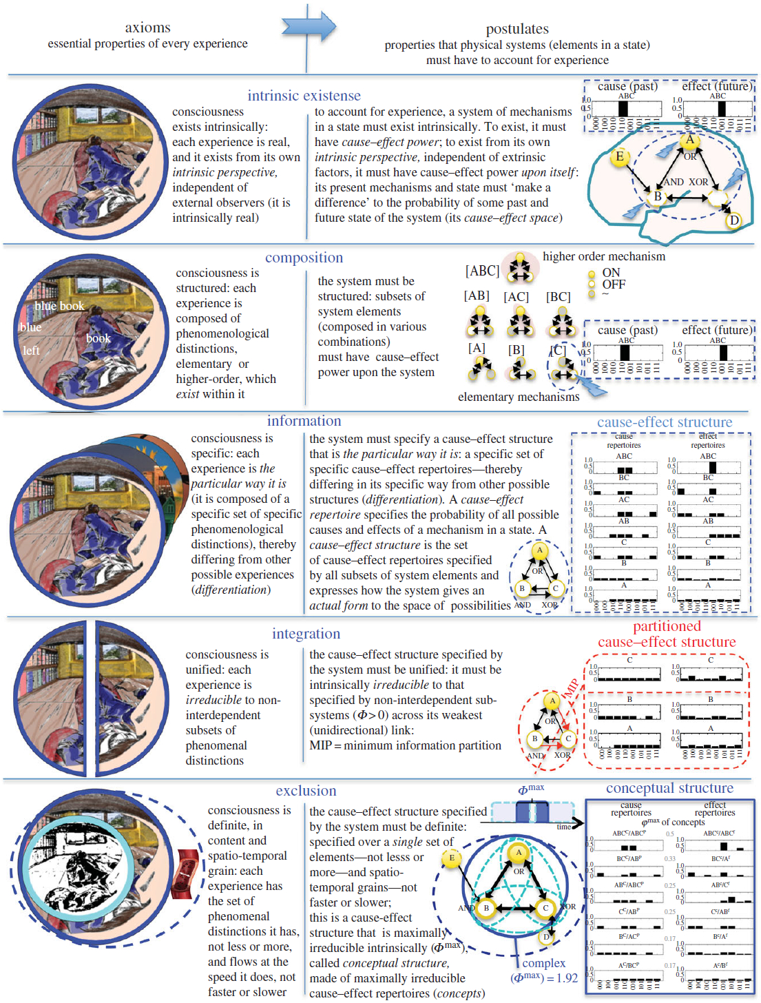 - Integraatio tarkoittaa, että tietoisuuden alustalla on oltava erityinen syyn ja seurauksen voima. Alustaa ei voi palauttaa osajoukoiksi, jotka eivät ole olemassa itselleen. Palautumattomuuden mitta on integroitu informaatio; mitä enemmän sitä on, sitä tietoisempi alusta on.